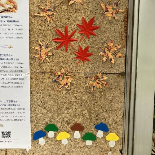 掲示板の折り紙が、紅葉とキノコに変わりました。赤い紅葉の周りの七つの紅葉に、沖縄の模様の折り紙が使用されています。