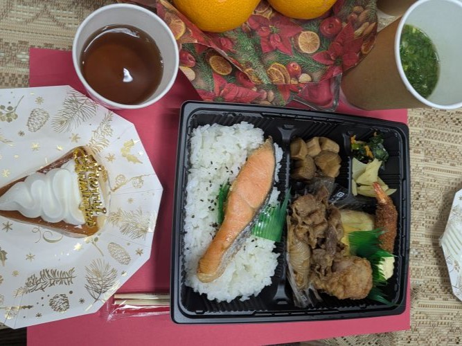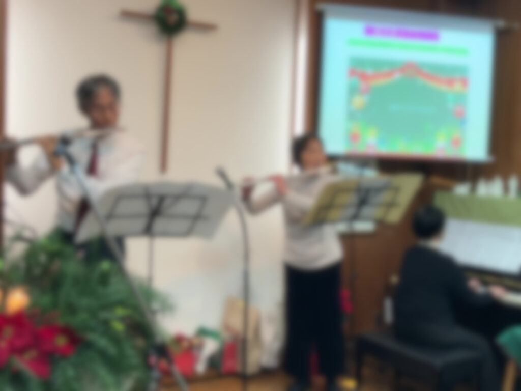12/21(日)にクリスマス礼拝を捧げました。礼拝後は愛餐会、祝会と和やかな時間を共に過ごしました。10月のファミリーコンサートに初参加された近隣の方が、愛餐会から参加してくださいました。四つのテーブルに分かれて座り、特撰幕の内弁当とケーキと美味しいお菓子で交わりを楽しみました。クリスマスのために、干し柿やお菓子など献品があり、心より感謝いたします。祝会ではオリジナルソング、リコーダー合奏、ティアレの賛美フラ、フルート二重奏、ピアノとバイオリン、ゲーム、プレゼント交換など喜びが溢れました。今年も共に主のご降誕をお祝いできたこと、心より感謝申し上げます。