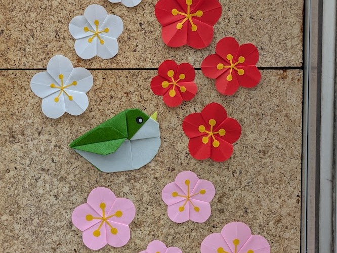 掲示板の折り紙が「梅と鶯」になりました。眺めていると、まるで梅の香りと「ホーホケキョ」というさえずりが聞こえてきそうです。