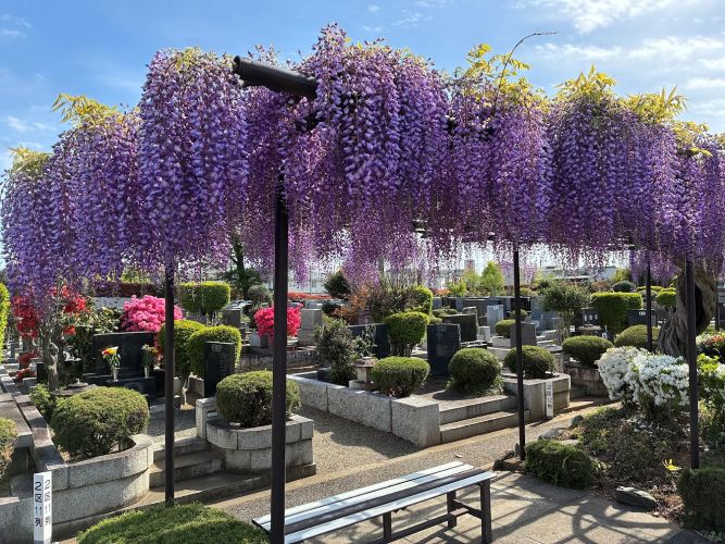 礼拝後、さいたま市の青葉園へ車二台で向かいました。予め注文していたお弁当を休憩所でいただきましたが、とても豪華でした。今までいろいろな季節に青葉園へ行きましたが、今年はちょうど藤の花が満開でした。休憩所からお墓に移動する途中の藤の花は、見事でした。お墓に着くと、先ず掃除をし、持参したお花を飾ってから、墓前礼拝の時を持ちました。礼拝後には、去年に続き今年もリコーダー献奏をしました。青空の下の礼拝や賛美は、天と共に捧げる気持ちです。その後、東屋でお茶の時を持ちました。初参加の3人の方々と共に、天に思いを馳せることができて感謝でした。